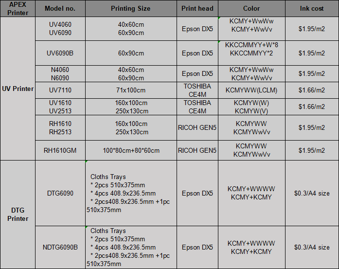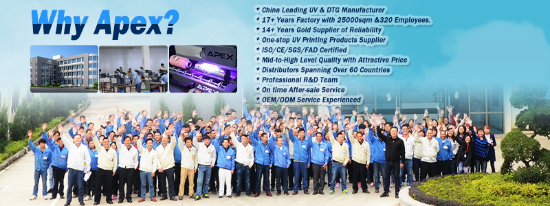 Η Apex αναπτύσσει, κατασκευάζει και αγορές ψηφιακούς εκτυπωτές UV και εκτυπωτές DTF για τη βιομηχανία εκτύπωσης και τη βιομηχανία σημάτων, τη βιομηχανία δώρων κλπ. Μεταξύ των προϊόντων της είναι: