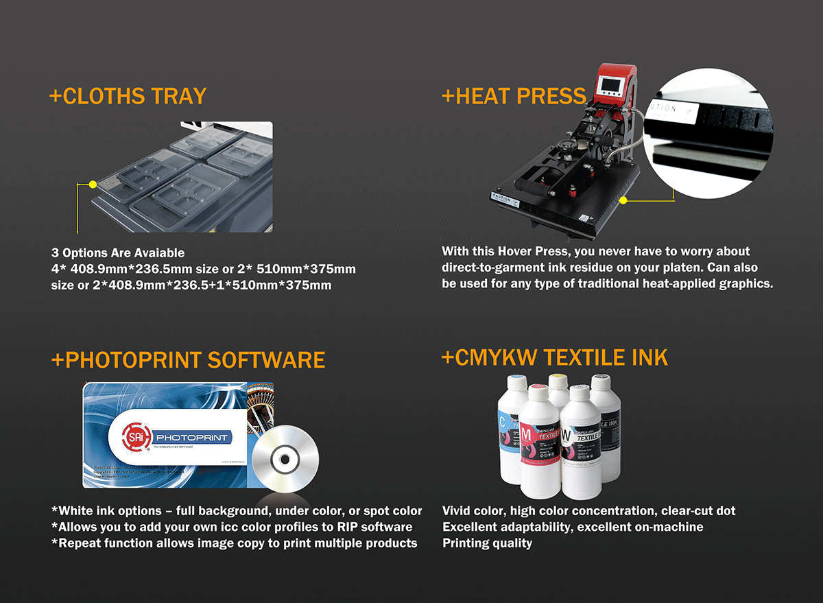 PhotoPrint Apex-jetソフトウェアと組み合わせることで、このプリンターは使いやすく、メンテナンスが簡単なデジタル衣類プリンターです。