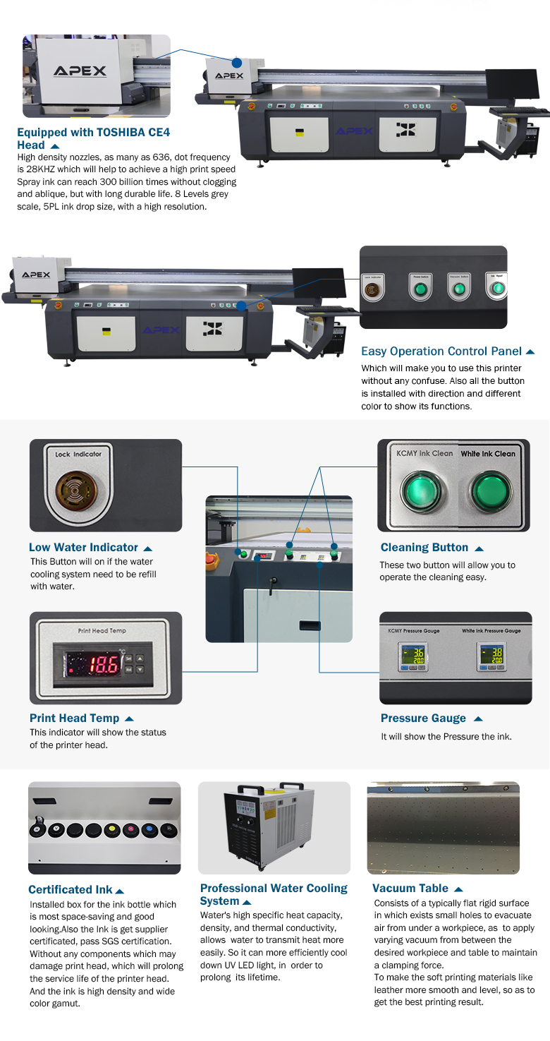 APEX UV1610 цифровой широкоформатный УФ планшетный принтер общий размер большого формата, подходящий как для массового производства, так и для печать большого размера требования. Устанавливается с 5 ~ 10 Голова Тошиба и предназначен для промышленного производства с высокой скоростью печати, которая может печатать практически на любом материале напрямую. С УФ-излучение при облучении в процессе печати изображения на поверхности объекта быстро высыхают, устойчивы к царапинам и УФ-доказательство,